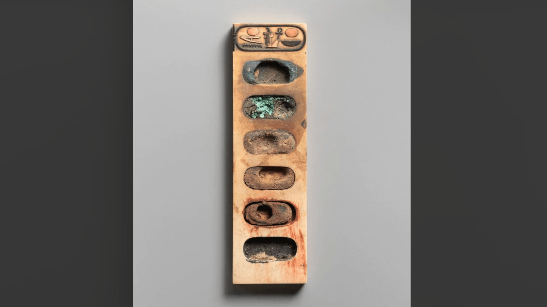 At first glance, this small carved object might seem simple. But those oval grooves once held vibrant pigments used by ancient Egyptian artists thousands of years ago. Did you notice the colors still lingering in the wells? 👀